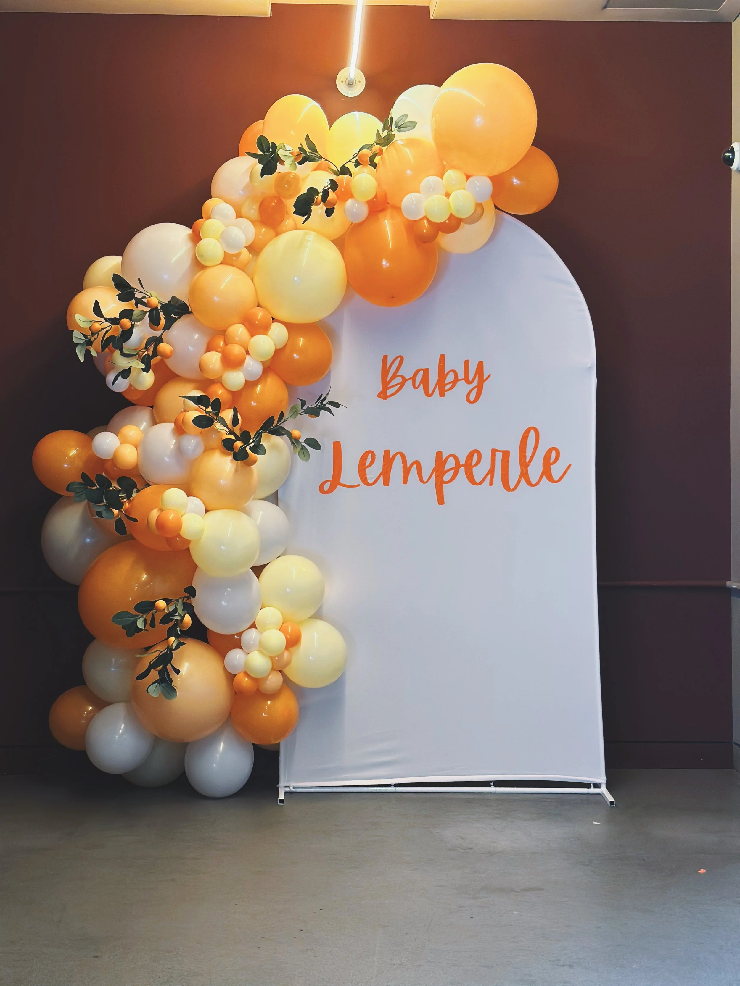 The focal point of the event was a 7.2-foot half-arch, nestled alongside a custom vinyl backdrop that read “Baby Lemperle” — a perfect Instagram-ready spot for guests and the glowing mama-to-be.