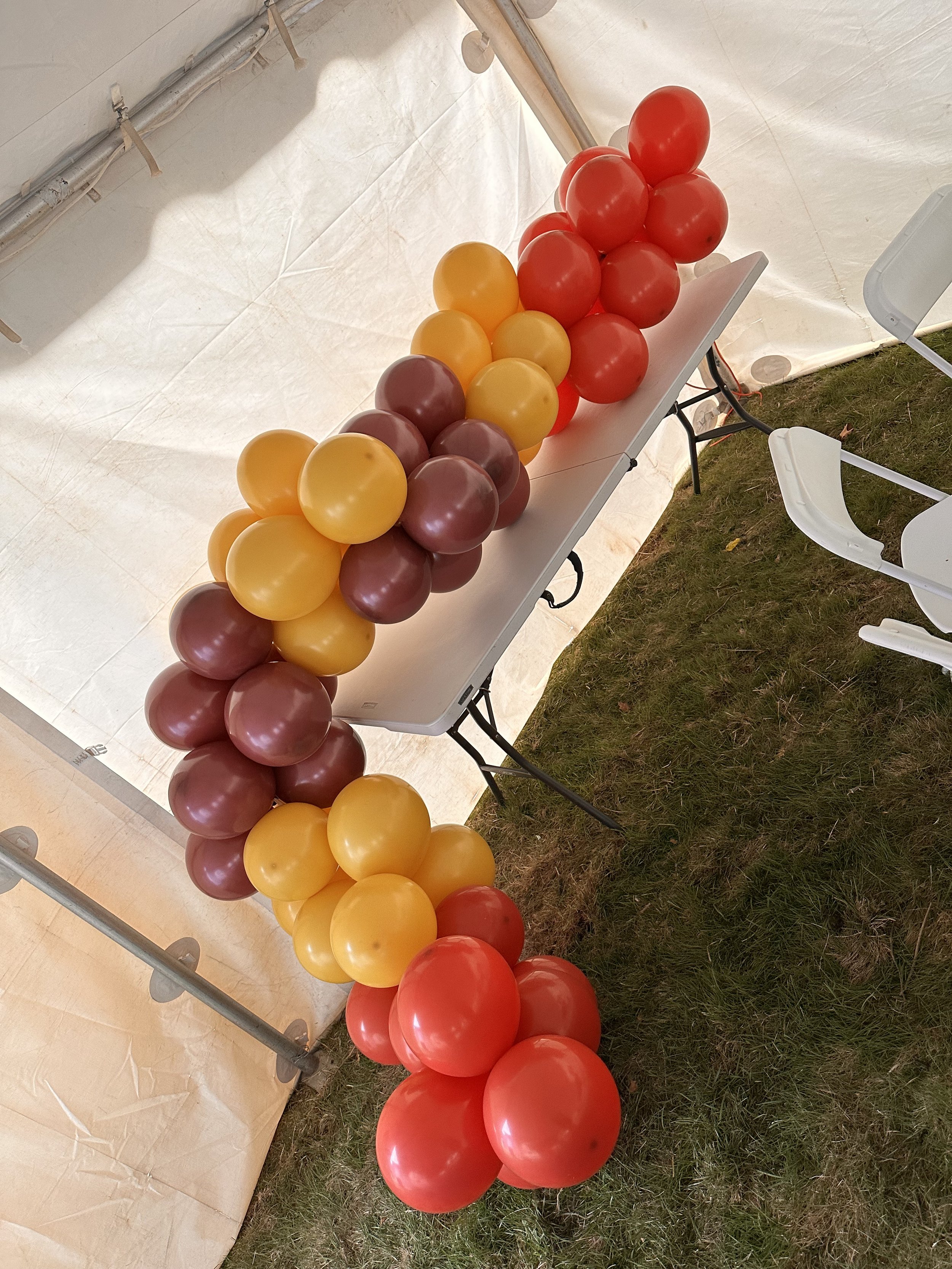 The balloon frame was covered with a beige arch spandex arch cover, with custom lettering in burgundy,